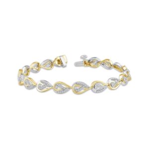 Round and baguette diamonds shine on a 10K yellow gold heart in this fabulous necklace for her. A white rhodium flash completes the look. With a total diamond weight of 1/2 carat, the pendant sways from an 18-inch cable chain that secures with a spring ring clasp.
