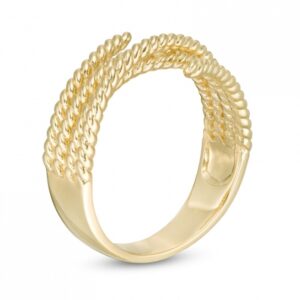 Crafted in warm 10K gold, this ring features a crisscross design with layers of ribbon wrapped around the outer ring. The gorgeous rope texture elegantly represents the Lasso of Truth. Polished to a brilliant finish, this ring will elevate your daytime or evening look.